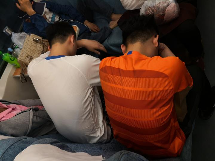 (在K1149次列车硬座车厢睡着的鲁能球迷,摄于2019年6月26日1时8分)