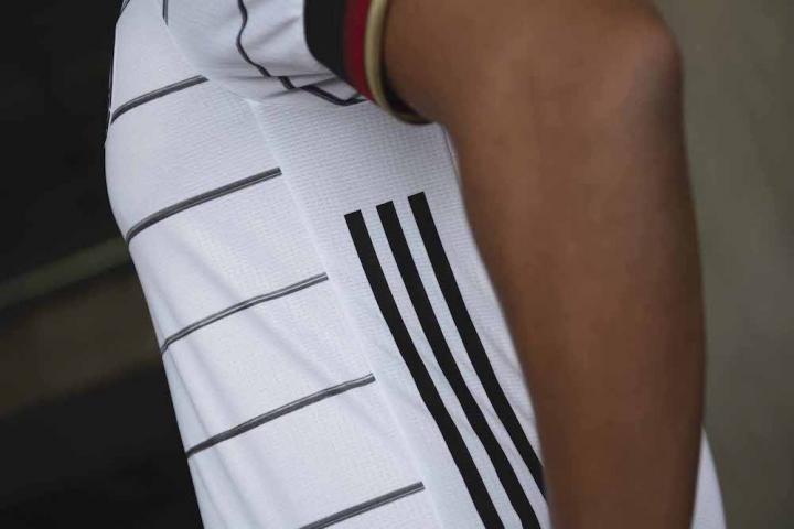 新球衣的袖子上也重新出现了德国黑红金国旗的颜色,而国旗细节中的动态线条则代表了德国球员和球迷的多元化,以此来体现这个国家引以为荣的团结与包容理念。
