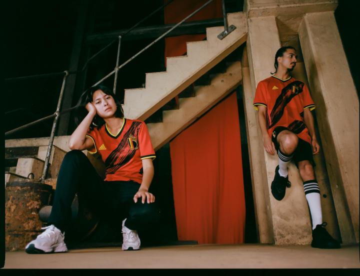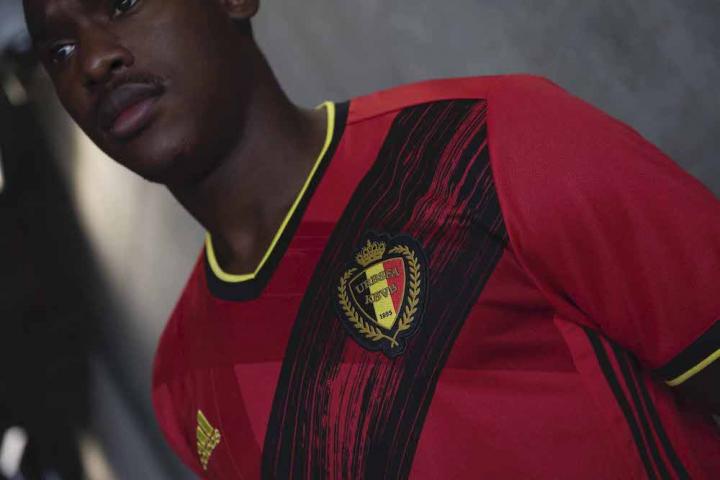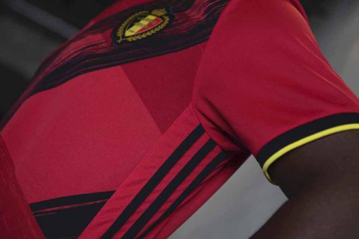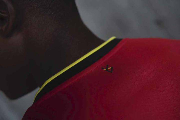 比利时新球衣致敬了国旗上鲜明的色彩设计,旗帜图案采用手绘的方式完成,直观地体现出球衣的艺术理念,而在其标志性图形上有线条交错成“B”字母图案。衣领后部还绣有另一个“ B”字母,两个字母展现了新款球衣巧妙的细节设计。