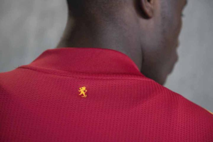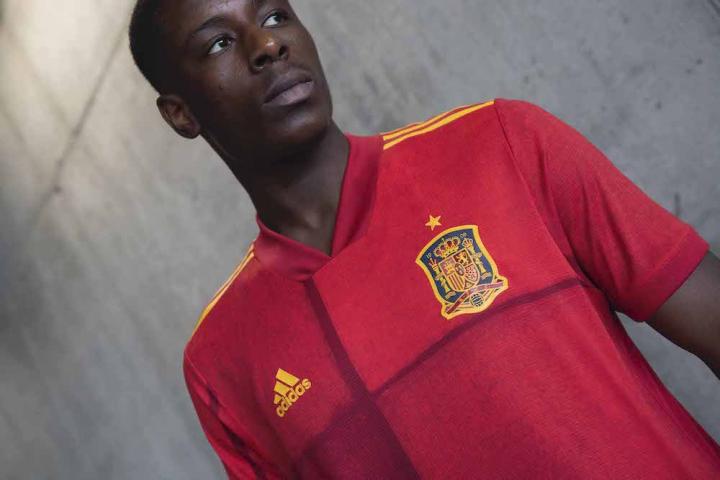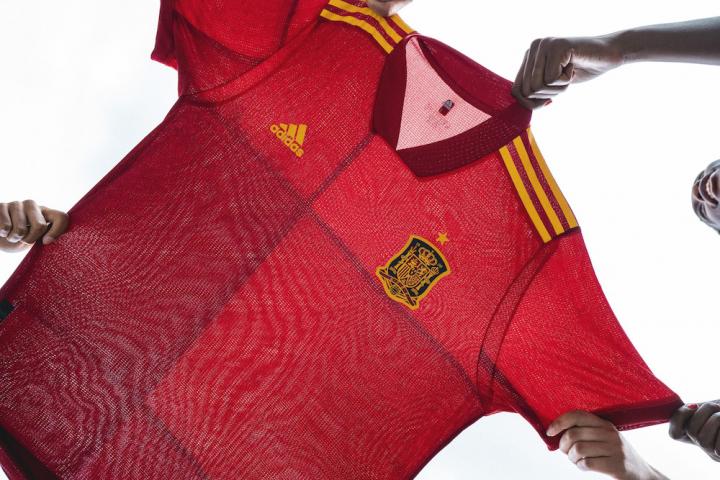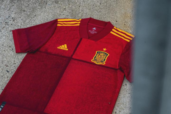 新款西班牙主场球衣设计是对经典艺术的现代诠释,以原始手绘艺术为特色,以暗红色和酒红色的色彩作为对国旗的抽象表现。阿迪达斯的创造者们在设计这件艺术品时采用了一种独特的方式,将国旗分解成单个的色块,最后通过球衣完整地表现出来。这一醒目的设计旨在为人们喜爱的国旗增添现代气息,并在领口后方上刻有“ 1920”字样,以纪念西班牙首件球衣和首枚标志性狮徽诞生100周年。