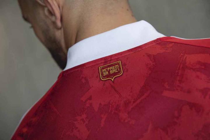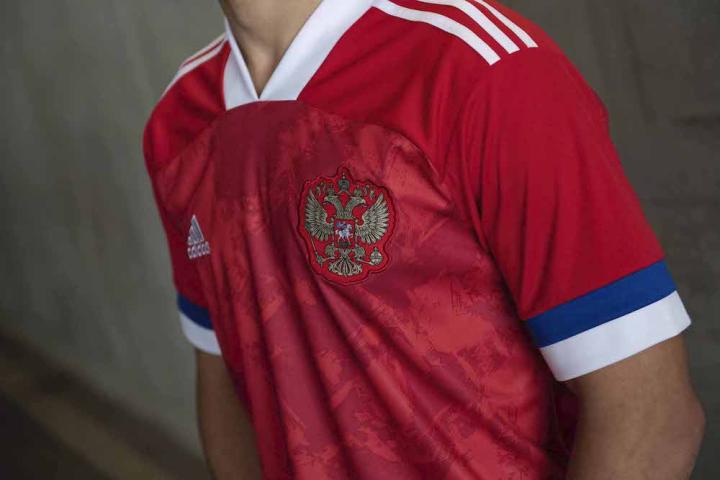 2020俄罗斯新球衣重新引入了国旗强烈、鲜明的色彩,并辅以暗红色色块,其灵感来自于传达其概念的艺术品。作为球员和球迷团结的象征,这件球衣的袖子上采用了蓝白相间的条纹。作为一件艺术品,手绘图案也是设计的一部分,为经典球衣提供了一个时尚且现代的外观。