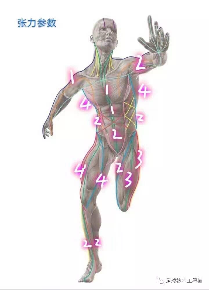 这张图的动态图制作太富有技术性,我的头发还是太多,做不出来。大家可以脑部一下,图片中的人如果动起来后,身上的数字在不停的变,当然这个变是有规律的、有比例的,要不然人就会失去平衡和动作不协调。这些随着动作随时有规律变动的数字就是发力方式(毕竟发力多少、角度、比例、先后顺序都是可以用数字来体现的),这些数字我称之为张力参数,这个张力参数对重塑发力方式意义重大。
