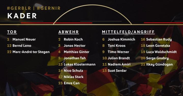 德国国家队更新了新一期大名单球员的球衣号码,维尔纳9号、布兰特10号、格纳布里20号。