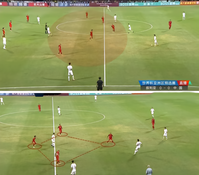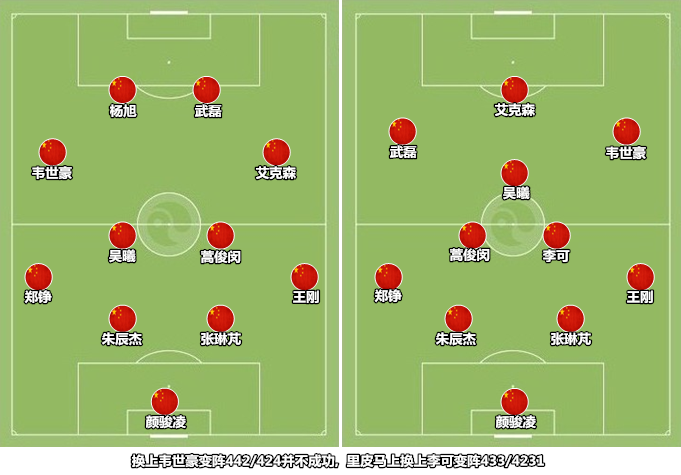 在国足变阵442/424期间,叙利亚看准机会连续发动边路进攻,国足中场脱节现象严重,侧翼防守出现了较大空当,前场球员很难得到地面支援。面对陡增的防守压力,里皮不得不换上李可重启433,吴曦在靠前的位置负责接应两条边路,承担后上冲击任务。