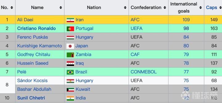 目前,C罗在国际比赛进球的排行榜上仅次于伊朗传奇阿里-代伊。前10名球员分别为:阿里-代伊(伊朗,109球)、C罗(葡萄牙,98球)、普斯卡什(匈牙利,84球)、釜本邦茂(日本,80球)、戈弗雷-奇塔鲁(赞比亚,79球)、胡辛-萨义德(伊拉克,78球)、贝利(巴西,77球)、科奇什-尚多尔(匈牙利,75球)、巴沙尔-阿卜杜拉赫(科威特,75球)、切特里(印度,72球)。