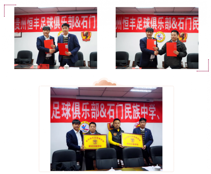会上,贵州恒丰足球俱乐部副总、青训负责人袁弋分别同石门民族中学、石门小学签署贵州少数民族地区青少年足球扶持共建合作协议,并同贵州恒丰足球俱乐部常务副总欧毅强将“贵州恒丰足球俱乐部青训卫星学校”授予两所学校。