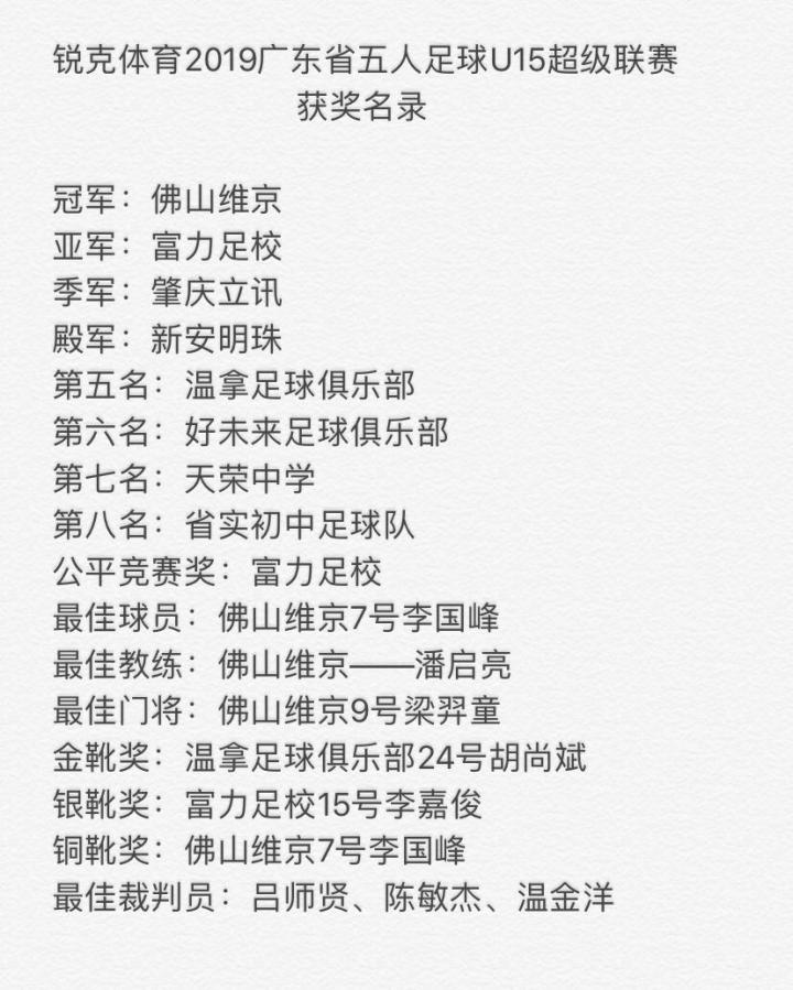 首届“锐克体育”广东省五人足球U15超级(小粤超)联赛获奖名单如下:
