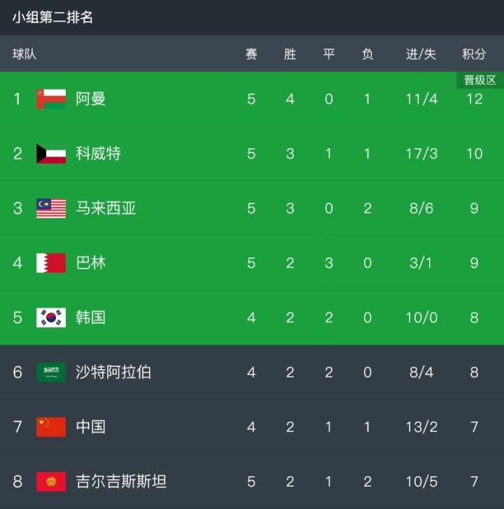 目前马来西亚队5场比赛后取得了3胜2负的成绩,位列最好的小组第二中的第三位,仅次于阿曼以及科威特。中国队目前少赛一场,位列最好的小组第二中的第7位。根据世预赛40强赛的规则,最好的4个小组第二可以进入到12强赛,若东道主卡塔尔位列其中,那么在小组第二排名第五位的球队也能晋级到12强赛。