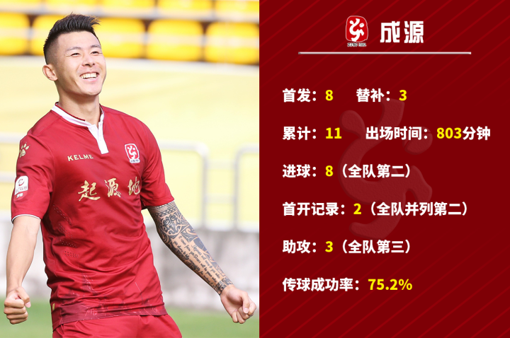 本赛季的中乙联赛中,成源代表淄博蹴鞠出场11次打进8球并贡献了3个助攻,是淄博蹴鞠赛季的效率王。