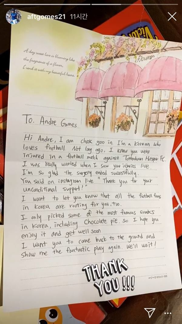 这位韩国球迷不仅邮寄了一箱精致的韩国零食,还送上一封信给戈麦斯。信中写道:“嗨,安德烈,我叫全国银(音译,原意为足球人),我是一名来自韩国的球迷,不久之前,我得知了你在同热刺的比赛中受伤,当我收看直播的时候,真的很为你感到担心。你在Instagram上感谢了球迷们的支持,我想和你说的是,所有韩国球迷都非常支持你。我给你邮寄了一些韩国的美食,包括巧克力派,我期待着你重新复出,并在球场上为我们奉献精彩的表演。我们会等待这一天!”