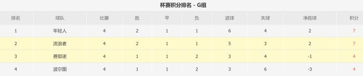 目前G组中年轻人和格拉斯哥流浪者虽然领先,但仅领先实力较强的费耶诺德和波尔图3分,在还有两轮的情况下,G组的排名恐发生较大的变化。