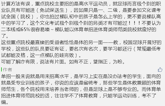 下面我们做一些计算,我们假设特招的名额全部招满,男足可单招350人,达二本线65%即可录取的为50人,达二本线可录取的为35人,女足为126人。因为女足的情况,我不是太了解,没什么发言权,以后可能会多关注一些,下面我们主要谈谈男足。