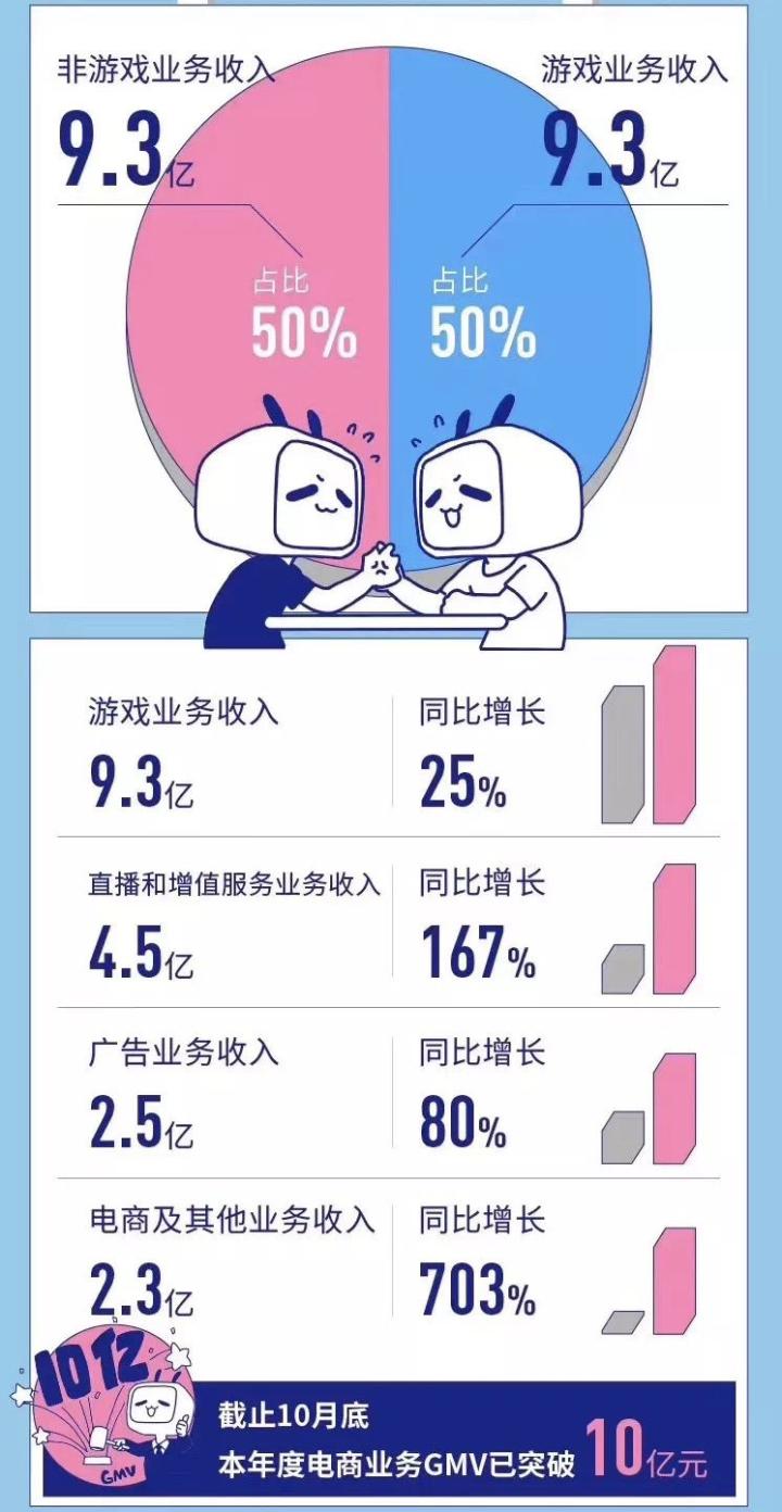 一直以来,他们的营收主要来自游戏、直播和增值、广告、电商及其他业务,但在上市之后,曾经游戏营收为主的他们,开始了探索多元化商业变现,其游戏和非游戏营收开始逐渐持平。