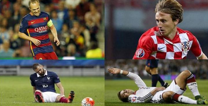 近段时间,各种肌肉损伤在足坛频频出现,扳倒了一大波球星:格策在与爱尔兰的比赛中内收肌肌腱撕裂,将可能错过2015年剩余所有比赛;莫德里奇在与保加利亚的欧洲杯预选赛中,右腿内收肌受伤;在法国对阵亚美尼亚的友谊赛中,本泽马因左大腿股二头肌受伤退场;状态正佳的阿圭罗突遭伤病打击,不幸在国家队比赛中左腿肌肉出现二级损伤;沃尔科特在对阵谢周三的比赛中拉伤腓肠肌;加上之前拉伤右大腿股二头肌的伊涅斯塔以及因为左大腿肌肉撕裂缺阵多时才复出的罗本,足够各位看官数上一阵的。
