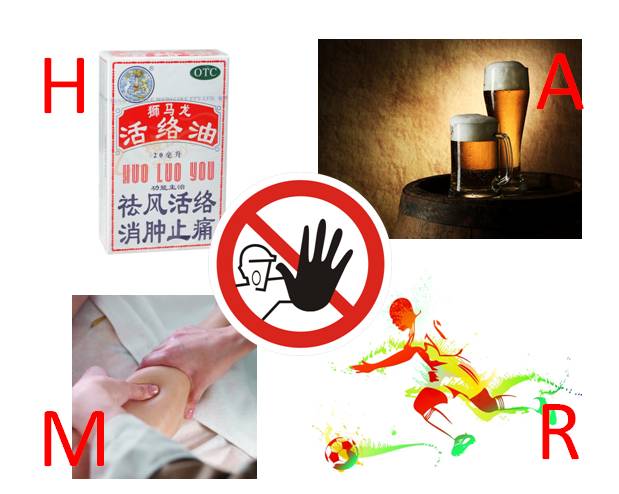 H(Heat,热疗):不能使用热敷以及会发热的药膏药油,都会造成局部炎症。