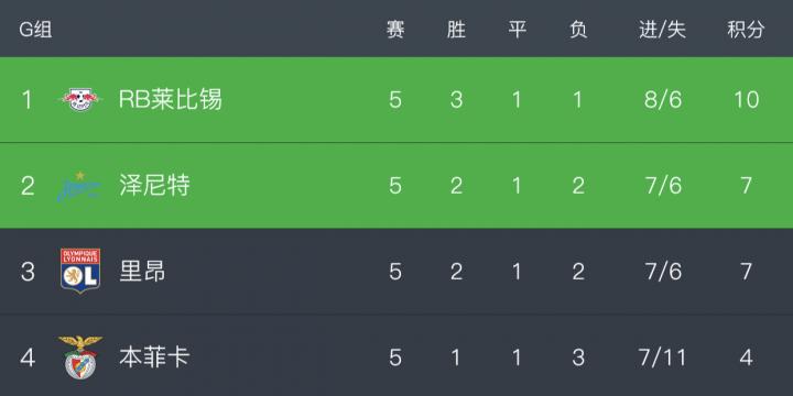 然而,如果里昂负于莱比锡而本菲卡战胜泽尼特,情况将完全不同。届时,里昂、本菲卡和泽尼特三队将同积7分。比较相互战绩,泽尼特(2胜1平1负)小组第二,本菲卡(2胜2负)第三,而里昂垫底!