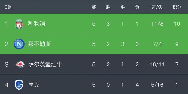 本组还可能出现的一种复杂局面是:利物浦负萨尔茨堡而那不勒斯平亨克。届时,利物浦、萨尔茨堡和那不勒斯将同积10分形成“连环套”。比较三队之间相互战绩,那不勒斯2胜2平,利物浦、萨尔茨堡同为1胜1平2负,但红军将因净胜球的劣势出局!