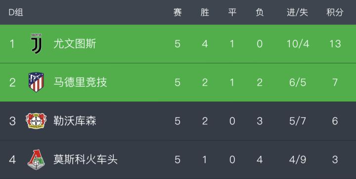 尤文确定小组第一,火车头确定出局,唯一的悬念就是马竞和勒沃库森的“二选一”。在落后马竞1分且客场进球少(主场2-1,客场0-1)的情况下,勒沃库森唯一的机会就是主场战胜尤文且火车头客场不输给马竞。但这种可能性微乎其微。