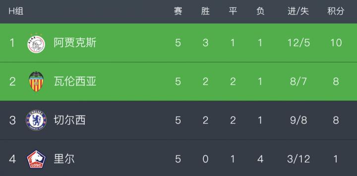 H组形势同E组相仿,阿贾克斯、瓦伦西亚和切尔西都有机会拿到小组第一。切尔西暂居第三,不过蓝军最后一轮的对手是垫底的里尔。第2轮客场挑战新赛季少了尼科拉-佩佩和拉斐尔-莱昂的里尔时,切尔西便2-1凯旋,如今回到主场显然更为主动。只要再胜,蓝军就将稳稳出线。