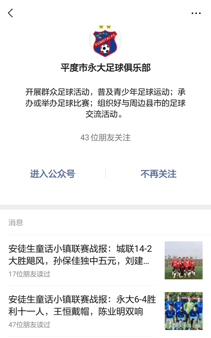 7.平度永大足球俱乐部官方微信公众号(公众号名称:平度市永大足球俱乐部)将每周给予赛事汇总报道,在每周的报道中,将使用明显的方式,帮助赛事赞助商的宣传。
