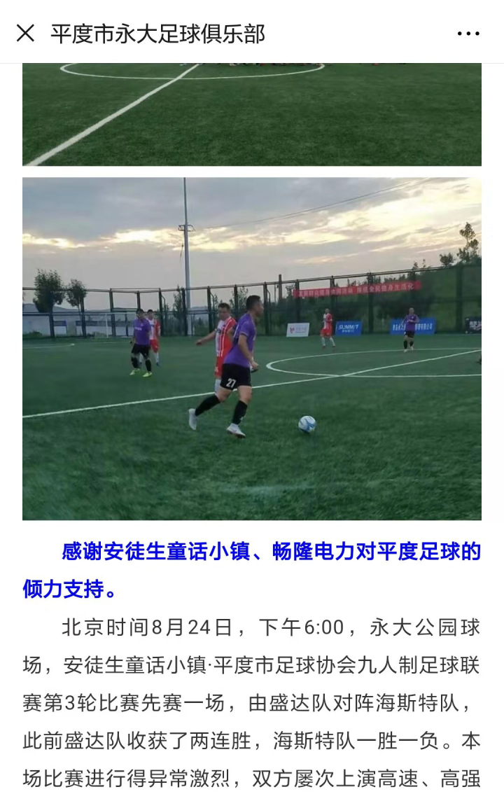 下图展示的是平度永大足球俱乐部官方微信公众号页面,安徒生童话小镇是2019年度平度市联赛的主赞助商 。