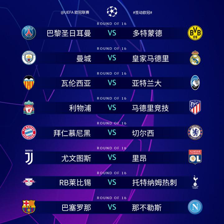 夏瑜琦2019-20赛季欧冠1/8决赛抽签结果揭晓,皇家马德里遭遇曼城,卫冕冠军利物浦抽到马竞,切尔西PK拜仁,而尤文图斯和巴塞罗那则抽到好签面对里昂和那不勒斯。