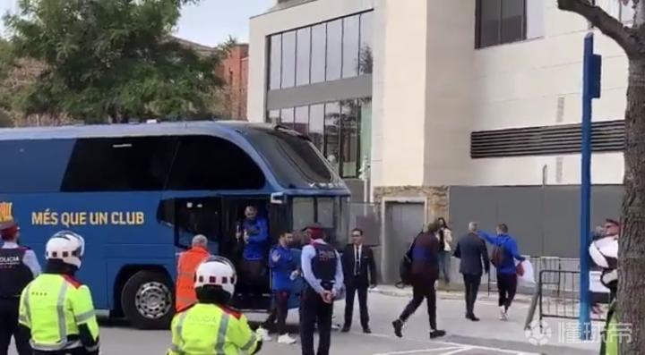 西班牙国家德比将在几个小时后开战,巴萨和皇马两队都选择了在赛前入住巴塞罗那的索菲娅酒店。就在刚刚,巴萨的大巴也已经顺利抵达。