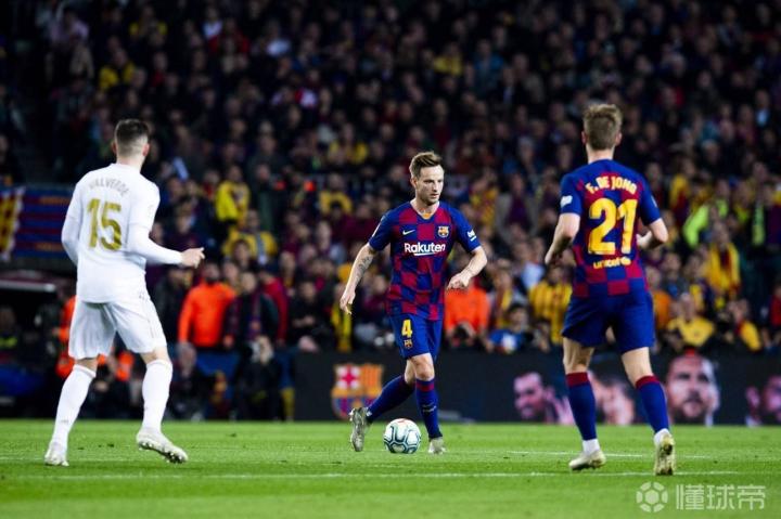 拖后中场的角色在一定程度上限制了拉基蒂奇的跑动接应能力强的特点,出现在他身前的德容和罗贝托都是攻强守弱,巴萨的中场在对抗中处于下风。特尔施特根利用球门球直接找到前场球员,梅西接应回做后发动进攻成为了巴萨在上半场中段唯一可靠的向前路径。F.巴尔韦德和克罗斯同时向前压迫,中圈弧区域比较空虚,但皇马球员此役的回防速度很快,而巴萨的前场缺乏速度型球员,皇马对梅西的夹击能够有效地减缓巴萨的推进速度,为整体落位赢得时间。