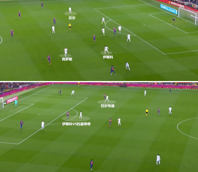 在比赛的前10分钟,皇马囤兵后场组织防守。就像很多使用4312阵型的球队一样,齐达内也没能很好地解决“无翼”阵型在低位防守时的落位问题,伊斯科和克罗斯都不适合长时间作为左前卫参与防守。幸运的是,右路的贝尔能够深度回收保护右闸,搭建一条临时的五后卫防线,左路的门迪顺势前顶配合伊斯科和克罗斯来延阻巴萨的右路进攻。皇马的防守建构在卫线和后腰球员的个人能力之上,前场球员参与防守的意愿决定了球队的上限,伊斯科和贝尔今天的表现彰显了这支球队的潜力。
