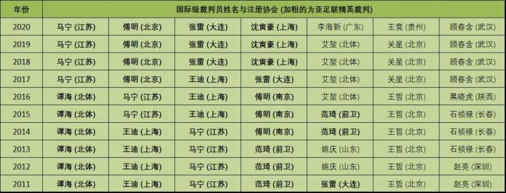 (图) 2011至2020年中国足协男子十一人制国际级裁判员报名信息 (粗体代表可执法亚足联旗下的赛事)