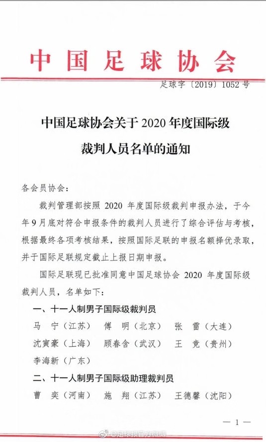 (图) 中国足球协会关于2020年度国际级裁判人员名单的通知