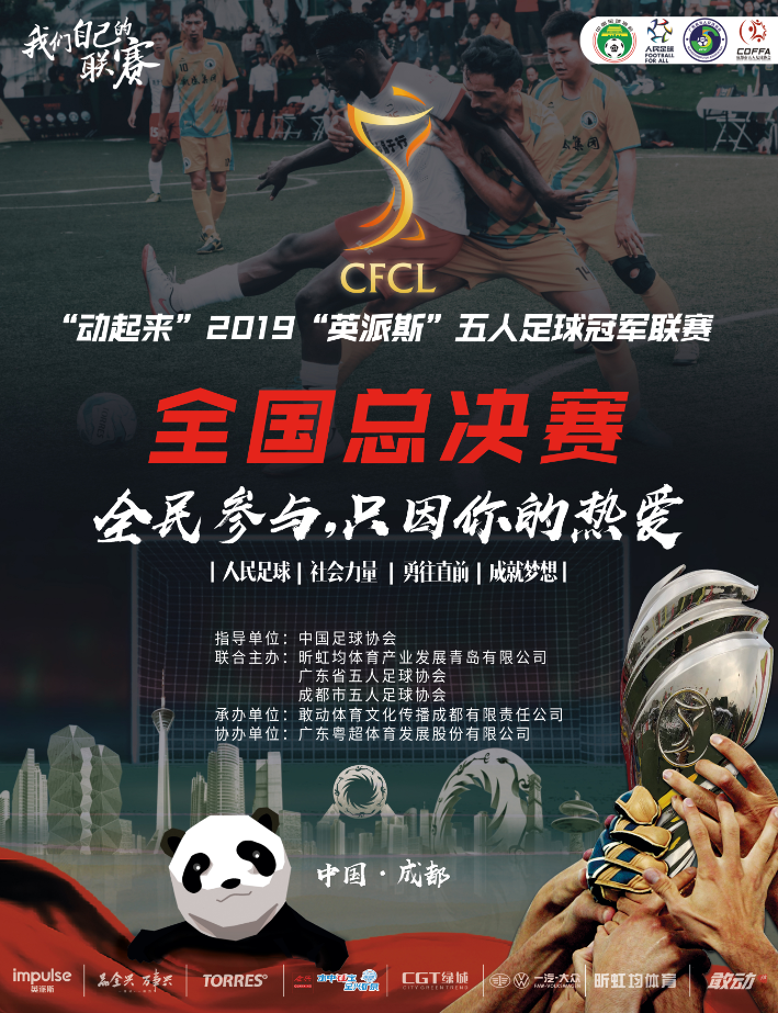 五冠联赛“动起来”2019“英派斯”五人足球冠军联赛(简称“五冠联赛”)全国总决赛,将于12月28日、29日在成都市西村大院皇家贝里斯足球基地隆重举行,五冠联赛历时6个月的比赛,从省级联赛到大区赛,24个省自治区直辖市群雄逐鹿,最终,产生了全国最强的七支队伍,即将在成都集合,争夺今年五冠联赛的全国总冠军!