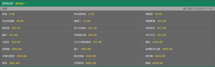 本赛季的英冠联赛已经结束了23轮的较量,西布朗凭借14胜8平1负的出色发挥,拿下了英冠联赛半程冠军,而利兹联紧随其后,排名联赛第二位。目前以西布朗、利兹联组成的英冠第一集团已经与后方球队拉开了较为明显的积分差距,故两支球队都是本赛季的升级热门球队。欧洲数据机构更新了最新一期英冠夺冠赔率,详情如下: