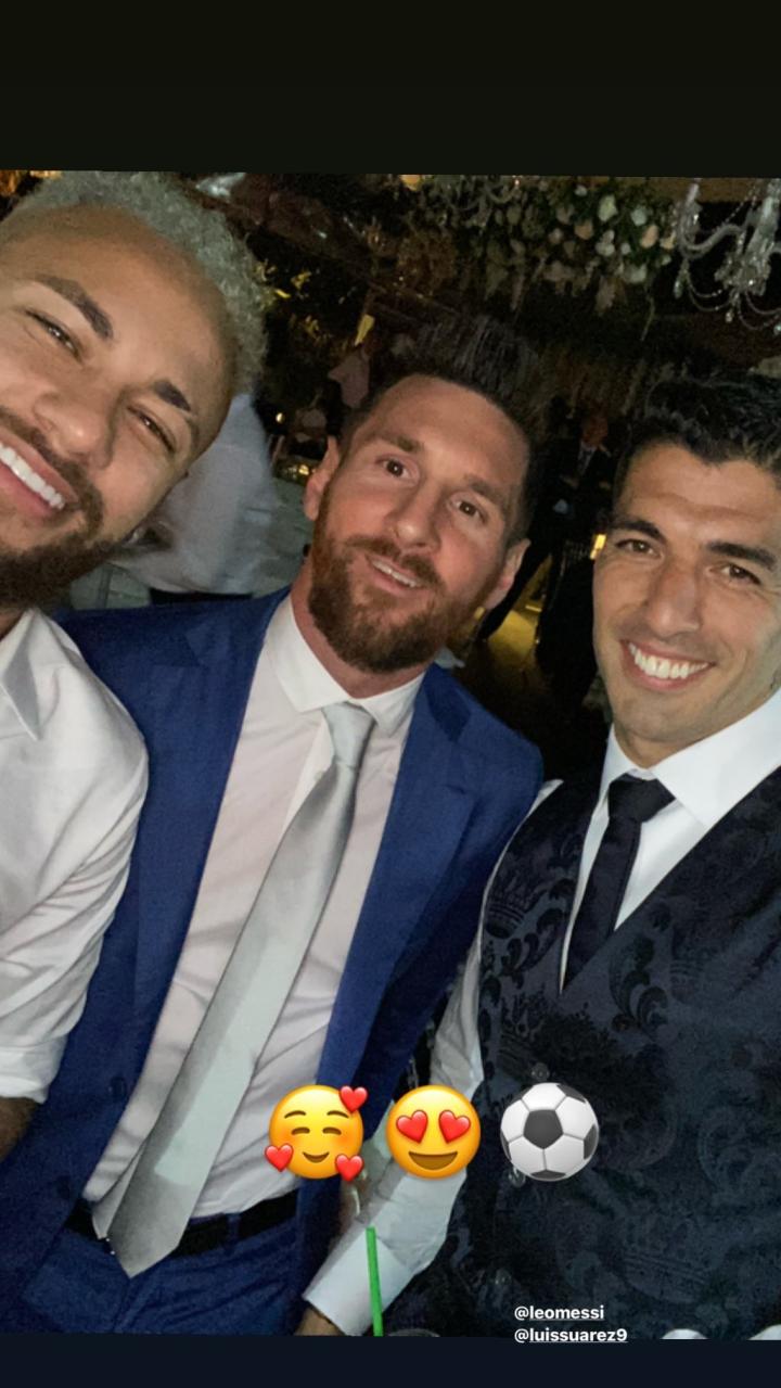 内马尔发布的合照里,三人都是一袭正装,言笑晏晏,苏亚雷斯手中还捧着马黛茶。内马尔还在图片上添加了三个表情,爱心和足球象征了三人之间的友谊。