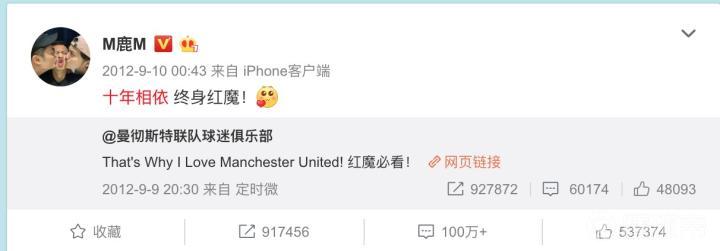 2009-2019年被评论次数最多微博:鹿晗转发曼联宣传视频