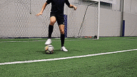 下面我们进入第一个技巧,首先一只脚从球前跨过,然后用另一只脚的脚内侧顺带向前推球,接着换脚将球拉回,并用脚内侧控制住,最后从另一边重复相同的动作,我们要找到节奏,两边来回交替。