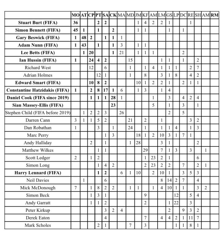 (图) 英超助理裁判与主裁判搭档执法各项比赛场次记录:横轴为裁判员姓名缩写(例: Michael Oliver- MO);纵轴为助理裁判员全名