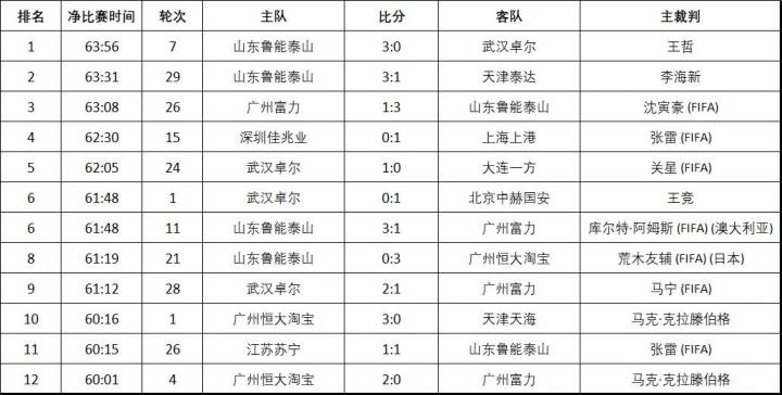 而净打时间与球队之间的关系似乎更为明显,赛季结束后各队净比赛时间的排名中,位列前三的山东鲁能泰山、广州富力与武汉卓尔在净打时间超过60分钟的榜单上均多次上榜。其实决定比赛流畅与否的因素多与球队打法和比赛的重要性密切相关。比如,这三支球队的打法都非常直接,防守习惯好,犯规次数较少,而且不太会拖时间,这也就决定了比赛中较长的净打时间。而通过数据还可以发现,这12场比赛中很少涉及到双方球队直接争冠或保级的情况,因为这种焦点大战是少不了火药味的,净比赛时间也长不了。这些才是直接决定净打时间长短的重要因素,过度强调裁判员的执法能力与净打时间的关系没有任何意义。