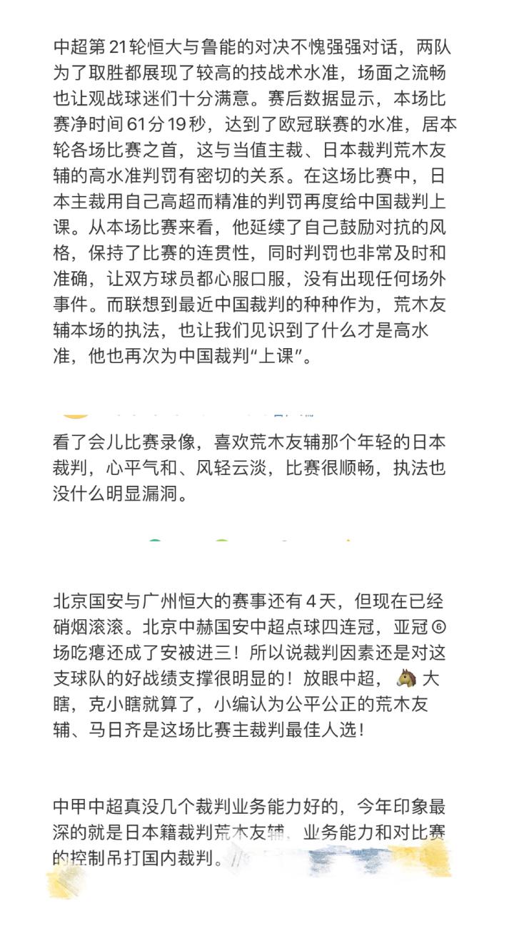 经常见到球迷格式吹外籍裁判控场更为流畅,最典型的是牺牲判罚准确度以保证流畅性的荒木友辅非但没受到批评,反而因为比赛流畅受到球迷和媒体的一致好评,而本土裁判却经常被当做在比赛流畅度上的反面教材。小编非常疑惑,难道广大球迷为了多看那么几分钟流畅的比赛,完全可以不管裁判的判罚是否准确吗?难道点球就可以随意漏判了吗?我们本土裁判照样能够执法出多场这样流畅的比赛,为什么没有任何媒体曾经提及过?难不成本土裁判还需要学习这种漏洞百出的判罚?