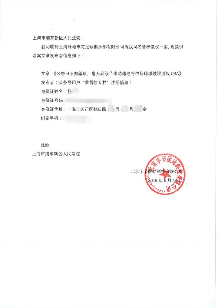 经过浦东法院审理,“今日头条”于2019年6月,向浦东法院提供了“黄哲徐专栏”的注册信息,包括姓名、身份证号码、身份证住址、注册手机等。在获得上述信息后,因该人户籍在上海市闵行区辖区内,俱乐部于2019年7月,在上海市闵行区人民法院,提起了以该人为被告的名誉权诉讼。