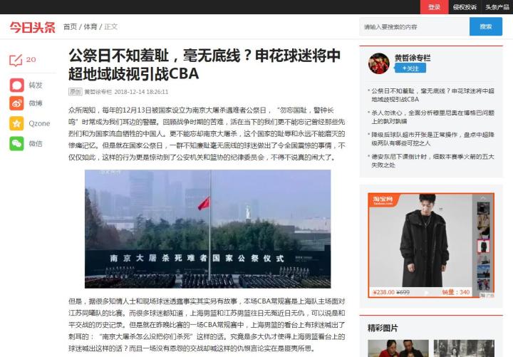2018年12月,今日头条号“黄哲徐专栏”,在今日头条网站和APP上发布了造谣文章《公祭日不知羞耻,毫无底线?申花球迷将中超地域歧视引战CBA》。污称在CBA赛场上,以“国家公祭日”等词句,辱骂江苏同曦篮球队的人,系申花球迷。