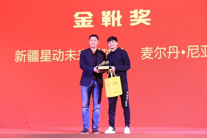 最佳射手(金靴):新疆星动未来足球队麦尔丹-尼亚孜 (22粒进球)颁奖嘉宾:前四川全兴足球队球员黎兵