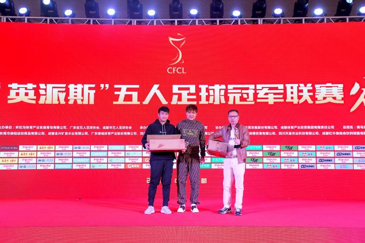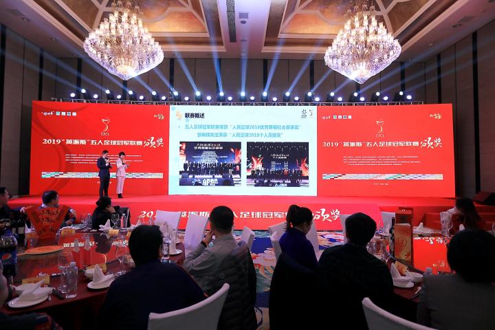 星光璀璨颁奖盛典29日晚,2019英派斯五冠联赛全国总决赛颁奖典礼在成都环球中心天堂洲际大饭店隆重举行,前四川省副省长徐世群、前四川省政府副秘书长蒋明政、前四川省机关事务管理局局长熊树林、四川省人大常委会委员、四川省工商联副主席朱华忠、四川省体育局体育产业处处长孙秀、四川省体育局体育产业处一级主任科员辜萍、成都市经贸局副局长罗峰、成都市武侯区工商联主席孙伟、成都市高新区桂溪街道办党工委书记巫全根、国务院足球改革部际联席会议办公室相关成员、中国足球协会社会足球部官员曾民、四川省钓鱼协会会长、四川体育产业集团董事长刘旭章、四川省足协秘书长胡鹏春、四川省体育运动学校校长李娟、四川体育产业集团总经理汤振宇、昕虹均体育董事长邹侑根、广东省五人足球协会会长刘孝五、青岛英派斯健康科技股份有限公司副总经理冯纵前、四川全兴酒业有限公司党委书记、副总经理薛新风、创世纪教育集团董事长杨杰、川籍明星廖健、闵天浩、文瑶、前四川全兴足球队主教练余东风率黎兵、姚夏、高建斌等全兴老球员及600位嘉宾莅临。