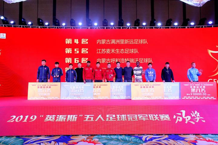 冠军新疆星动未来足球队、亚军广东联兴塑胶管业足球队、季军湖北华创足球队、第四名满洲里新远足球队、第五名江苏麦禾生态足球队、第六名内蒙古呼和浩特瑞沃足球队、第七名澳门千叶足球队、第八名四川自贡兴城租赁足球队。