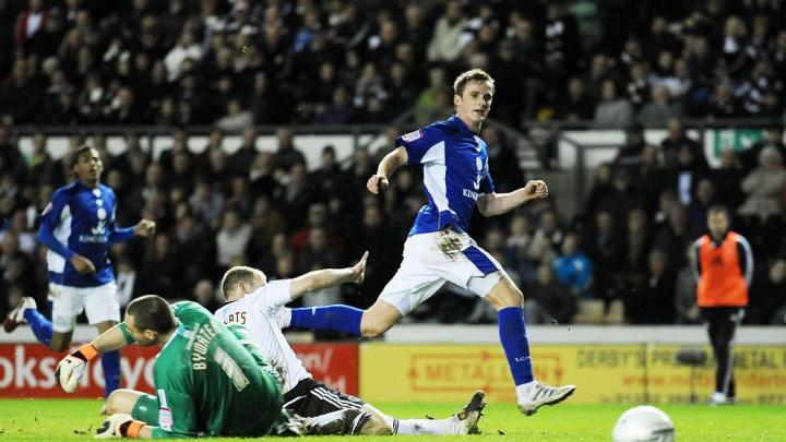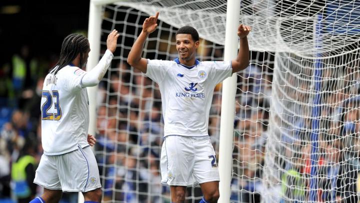 狐狸青训出品、如今已是莱斯特城传奇的安迪-金在球队2-0击败德比郡的比赛中进球。