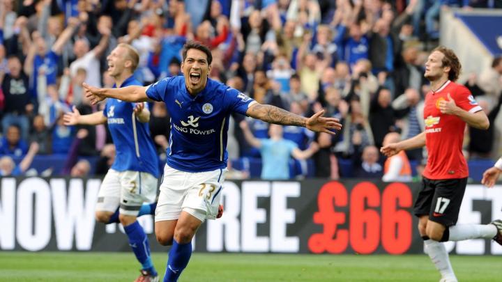 乌略亚在莱斯特城5-3击败曼联的比赛中梅开二度,图为他攻入第二球后庆祝。