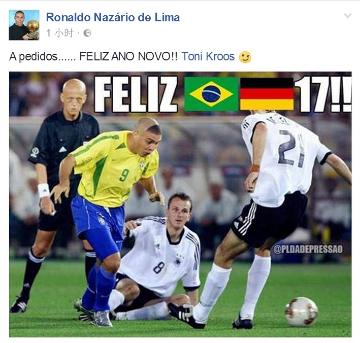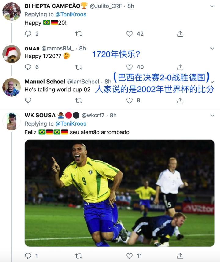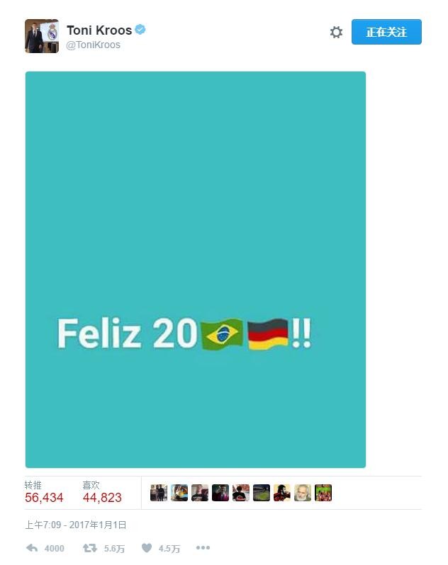 上图是2017年第一天克罗斯发布的推特动态,他用德国在2014年世界杯7-1血洗东道主巴西的梗来祝大家新年快乐,然而这条动态引发了很大争议,毕竟皇马队友马塞洛、卡塞米罗等都是巴西人,你这让人家怎么想?