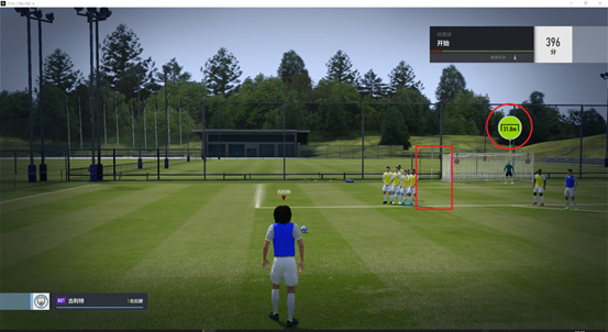 禁区外任意球如果角度太正,或者距离太近的任意球,可以通过战术配合来得分。如图所示,手柄按LT/L2,键盘按C呼叫第二名罚球队员;手柄按LB/L1,键盘按Z呼叫第三名罚球队员。