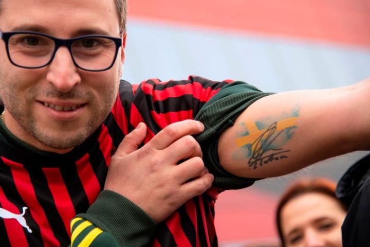 真爱!米兰球迷在发布会上展示伊布签名+瑞典国旗的文身Elix_wang @懂球帝2020-01-04 01:08在伊布重返米兰的发布会上,一名狂热的米兰球迷向大家展示了自己手臂上关于心爱球星的文身。在这名米兰球迷的手臂上,纹有瑞典国旗和伊布的签名字样,这也展现了他对于伊布的喜爱。伊布回归米兰后选择了21号球衣,并在当地时间1月3日进行了回归后的首场新闻发布会,据意大利媒体报道,有大批球迷前往发布会举办地点,米兰球迷也在用自己的热情欢迎王者归来。展开更多