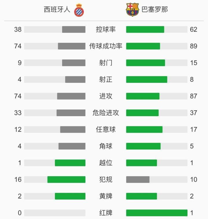 第64分钟,梅西中场持球长驱直入杀到禁区外直塞,苏亚雷斯点球点附近抽射角度太正被迭戈-洛佩斯扑出。第73分钟,西班牙人做出人员调整,武磊替换梅伦多上场。第74分钟,德容拉拽卡莱里犯规拿到第二张黄牌被红牌罚下。